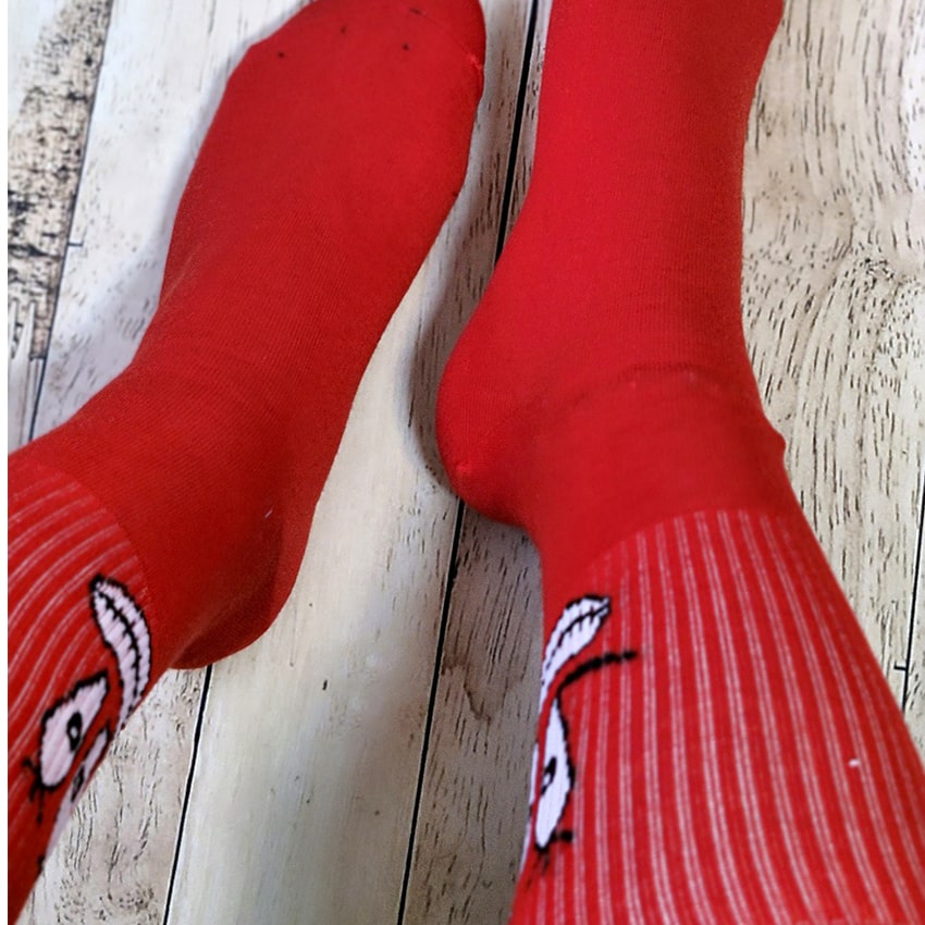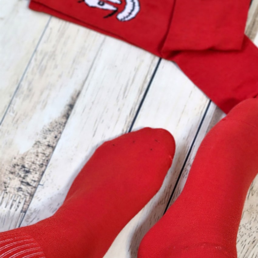 جورای قرمز طرح: لبخند جنس: نخ پنبه ساق: 14 سانتی متر