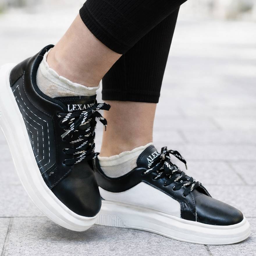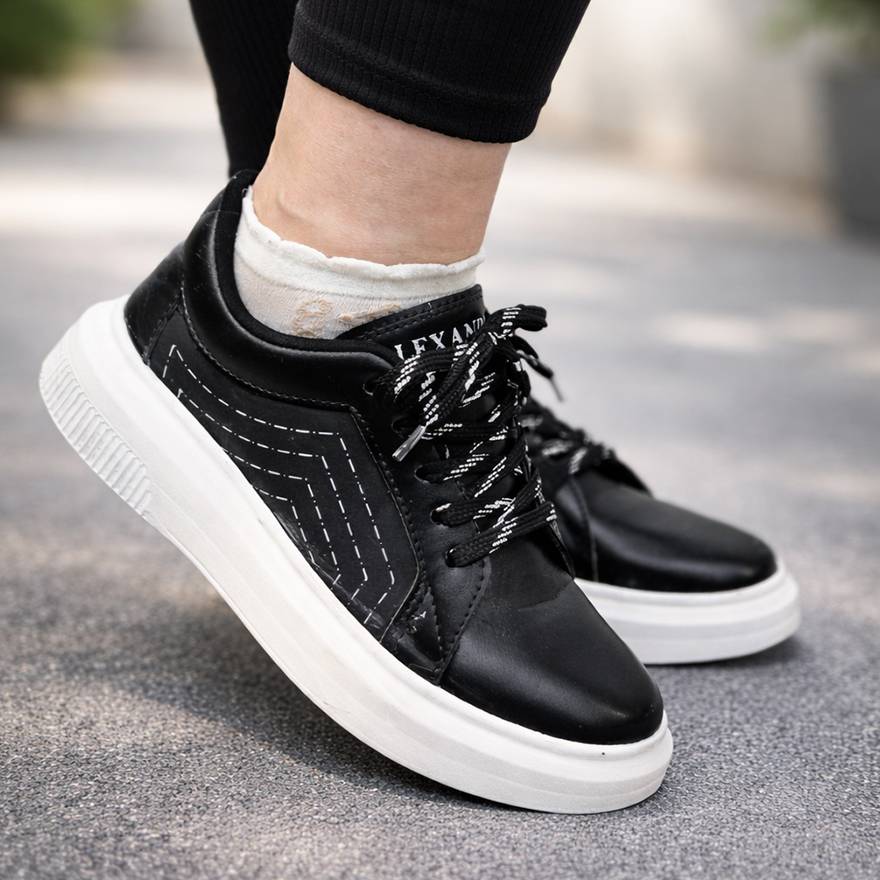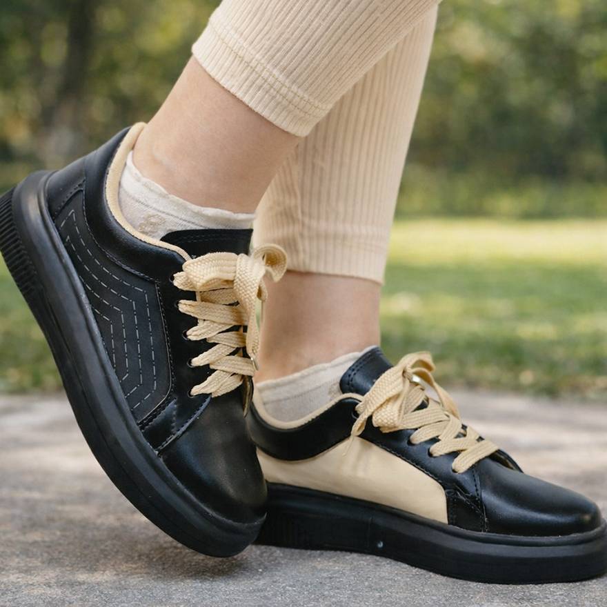 کتونی جنس : چرم رنگ : سفید / کرم ( زمینه مشکی ) سایز : 37 / 38 / 39 لژ : 3 سانت