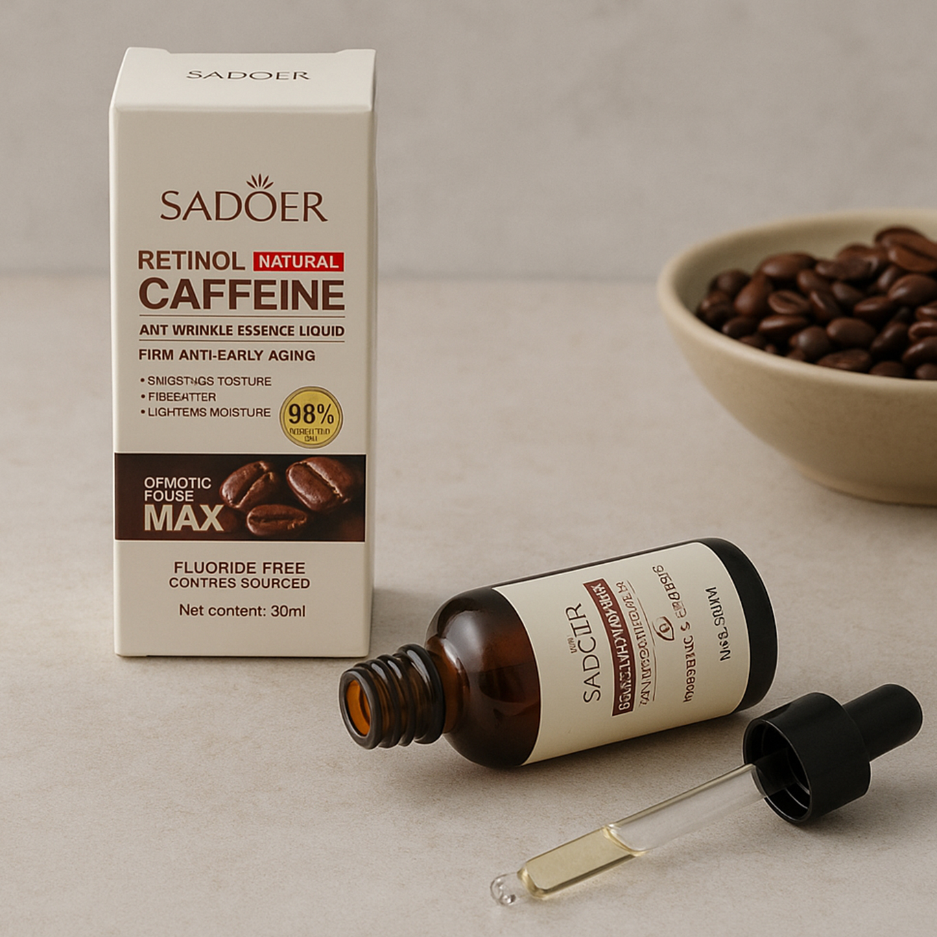 سرم حاوی کافیین سفت کننده پوست صورت خاصیت جوانسازی پوست ضد لک و روشن کننده ترمیم کننده پوست صورت محو کردن موثرخطوط ریز پوست با رایحه قهوه و فوق العاده دلنشین مواد مغذی در جهت جوانسازی